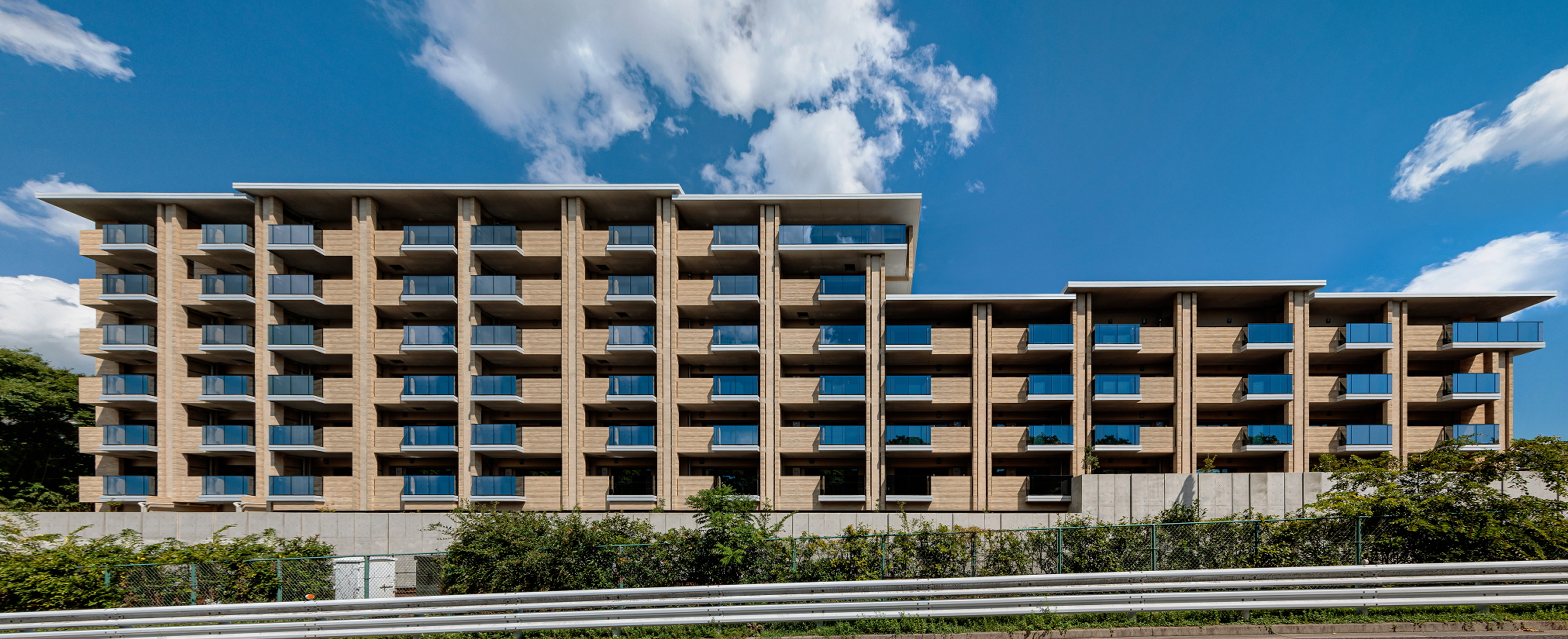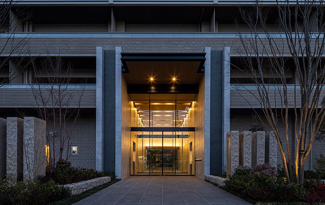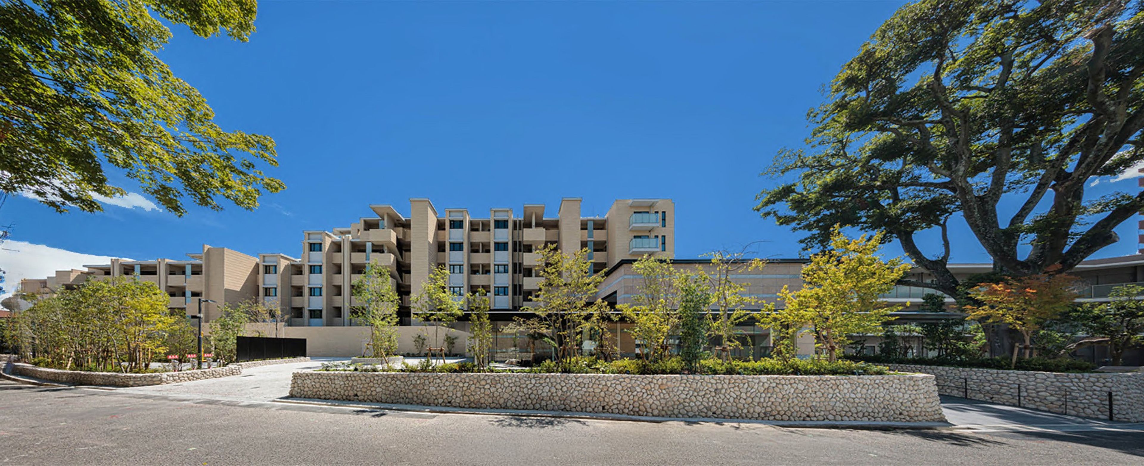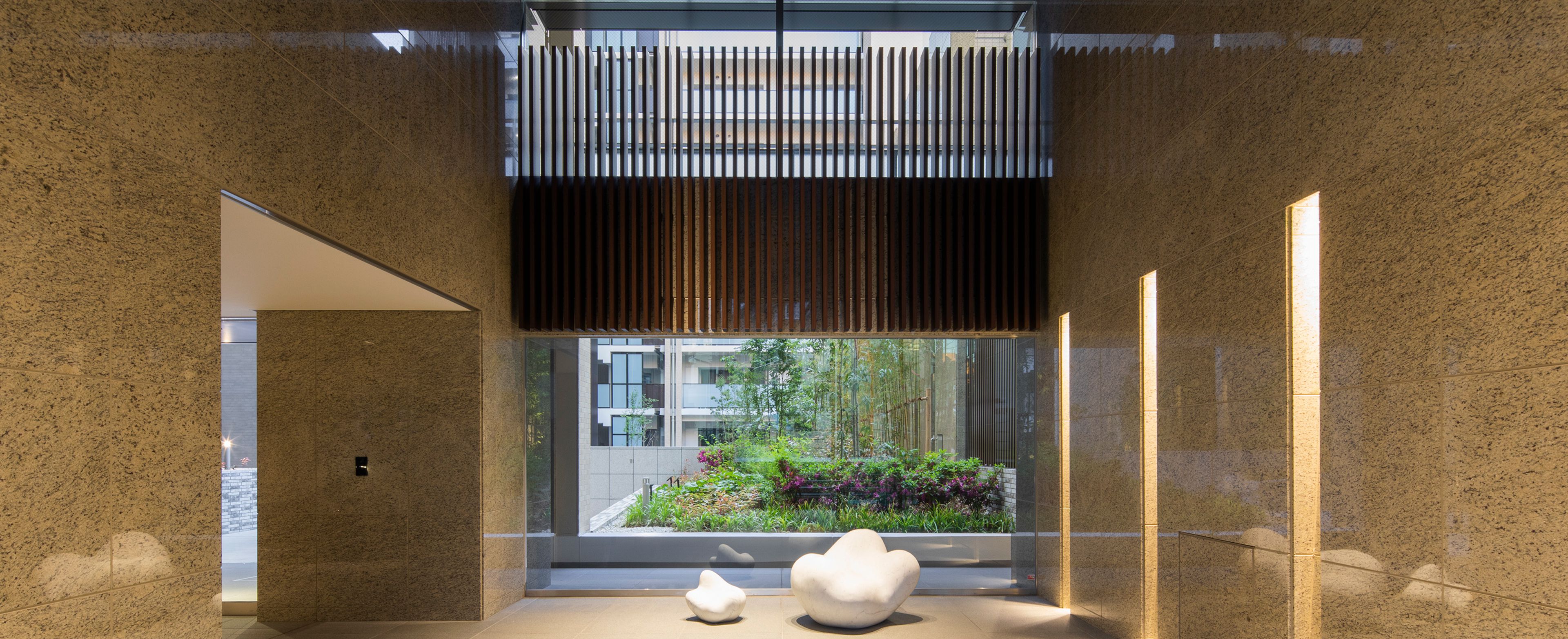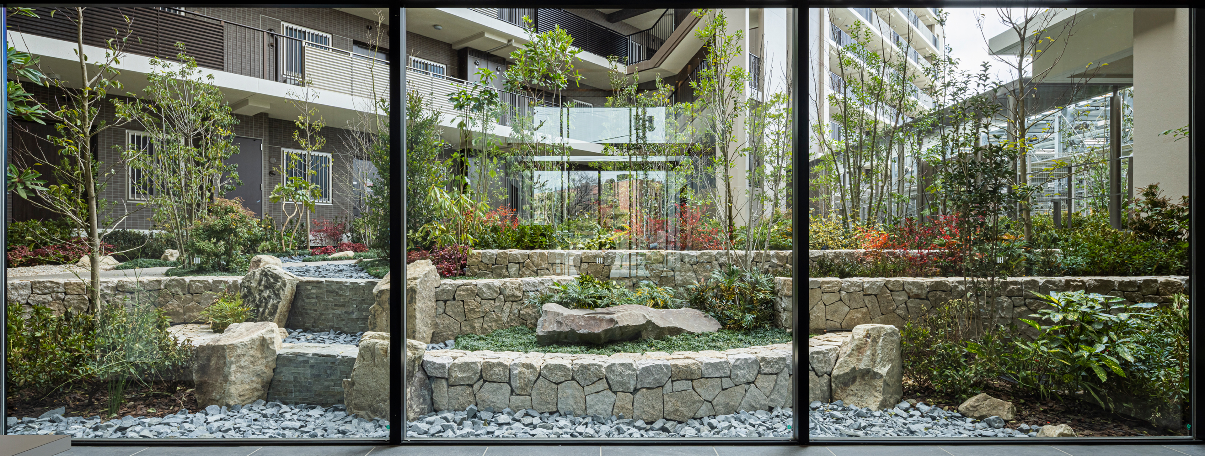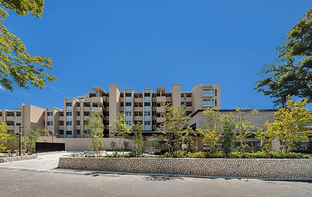 地権者の声を反映し、地域の深い愛着を受け継ぐ建替えプロジェクト - 大阪・神戸の中間、六甲山の麓に位置する集合住宅。御影石野住宅の建替え事業であり「近隣の皆にも喜んでもらえる建替えにしたい」という従来地権者の希望に応えた。容積率を消化しやすいL字型プランをあえてI型とし、ノイズとなる機械駐車場を地下平面駐車場とした。創出した余白には、御影の地に永く愛される石積や公園、そして隣地所有者とも同意の上保存した大樹を配し、伝統ある街並みと調和するデザインを実現した。