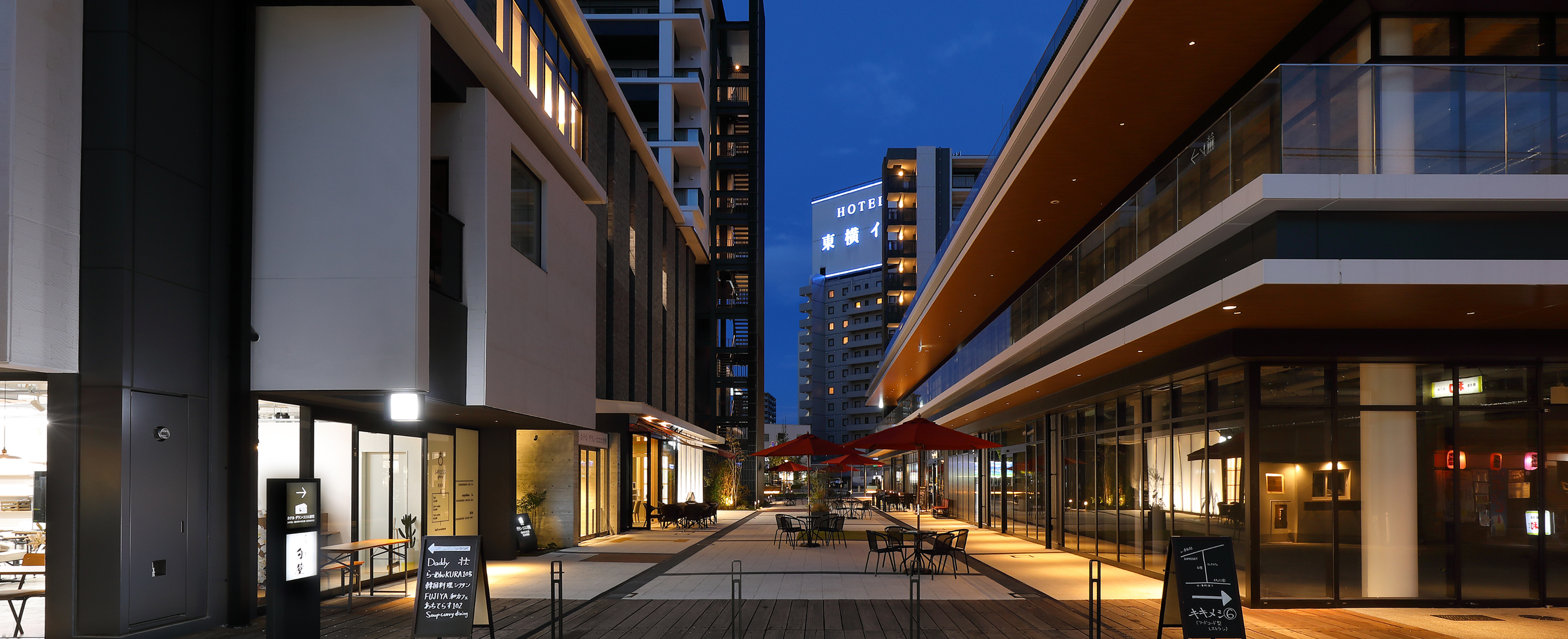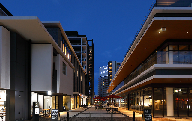 - 老朽化した木造住宅が密集し道路整備が不足する本地域は、過去に複数の火災もあり、長く防災面での課題を抱えていた。1994年民間主導で開発構想が持ち上がり、洪水浸水想定地域での水害対策機能を加えて、まちを紡ぐ新たな防災拠点・交流拠点として2021年10月に再生を実現した。地域における持続的な賑わい創出のために一体型滞在快適性等向上事業と位置づけ、官民一体で地域の活性化を実践している。