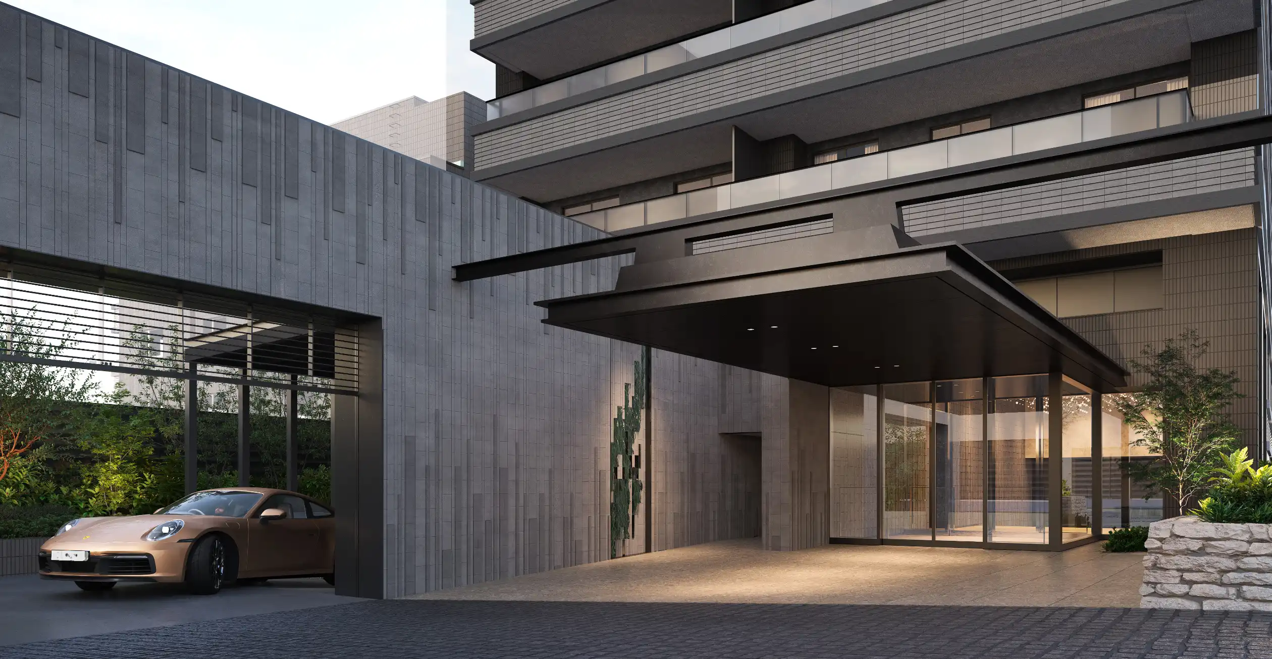 街への顔となるエントランスゾーンは、前面に大きな壁を設けて結界とするのではなく、アプローチを前面道路から一歩内側へ引き込み、街並みへの圧迫感を払拭しながら、住まいとしてのゆとりと温もりを守る巧みな工夫を凝らしています。また、エントランスの歩行者動線にはウォールゲートを立ち上げ、車寄せから地下駐車場へのカーアプローチにはグリルシャッターを備えたゲートを設置し、プライバシーへの配慮も施しています。