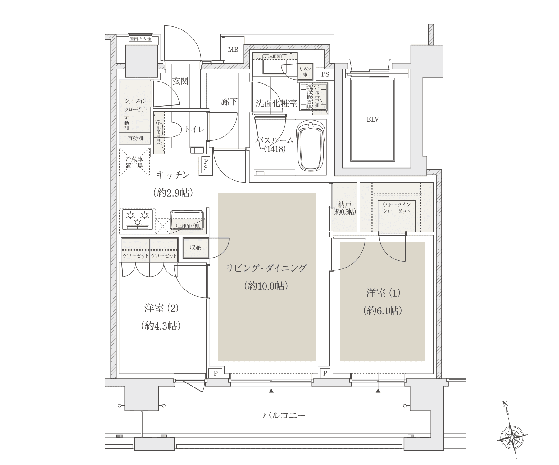 55D TYPE(2階) 2LDK+WIC+SIC+N 専有面積58.10㎡ バルコニー面積11.84㎡ 床暖房範囲 収納 WIC:ウォークインクローゼット SIC:シューズインクローゼット 一覧へ戻る
