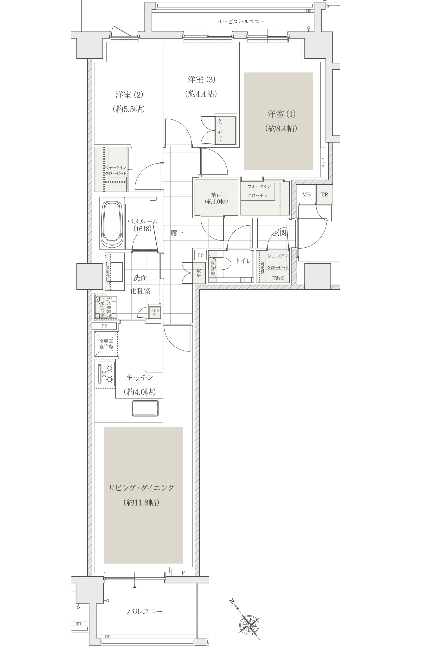 80A TYPE 3LDK+2WIC+SIC+N 専有面積82.99㎡ バルコニー面積(2〜4F)6.08㎡ (5F)6.23㎡ サービスバルコニー面積4.68㎡ 床暖房範囲 収納 WIC:ウォークインクローゼット SIC:シューズインクローゼット N:納戸 一覧へ戻る
