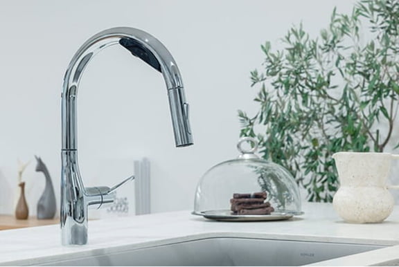 キッチン水栓のシャワーヘッドに浄水器を内蔵。手をかざして出水・止水できるタッチレスを採用しました。
