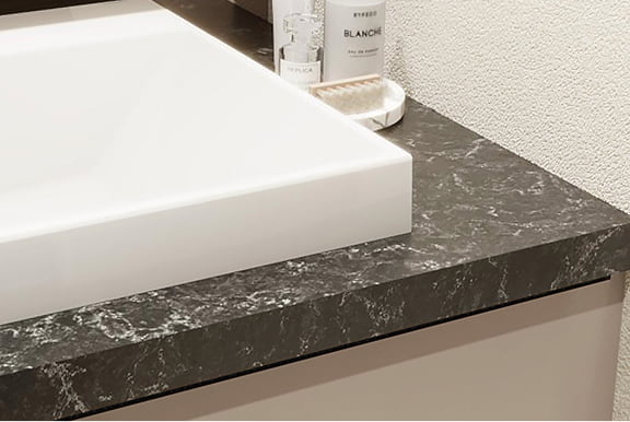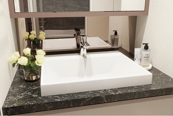 落ち着いた質感とスタイリッシュな形状の陶器製洗面ボウルを採用。