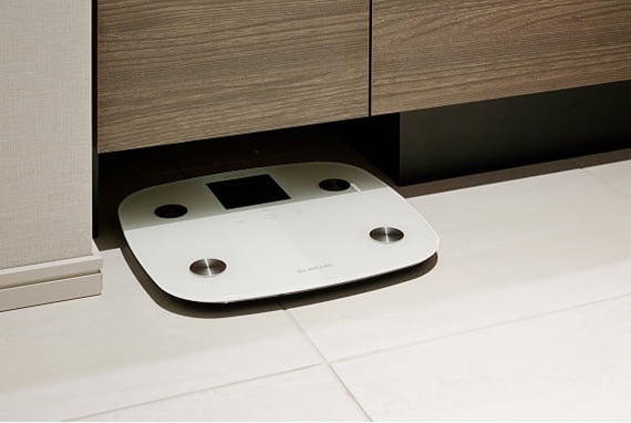 洗面化粧台の巾木開口部に、ヘルスメーターをすっきりしまえます。