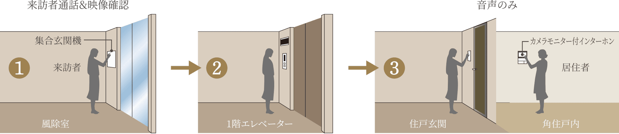 建物内への不正な侵入を抑止するために、トリプルセキュリティを採用。1階には風除室に加え、エレベーター前にオートロックを配した二重のセキュリティに、各戸のロックを加えた安心のトリプルセキュリティシステムです。