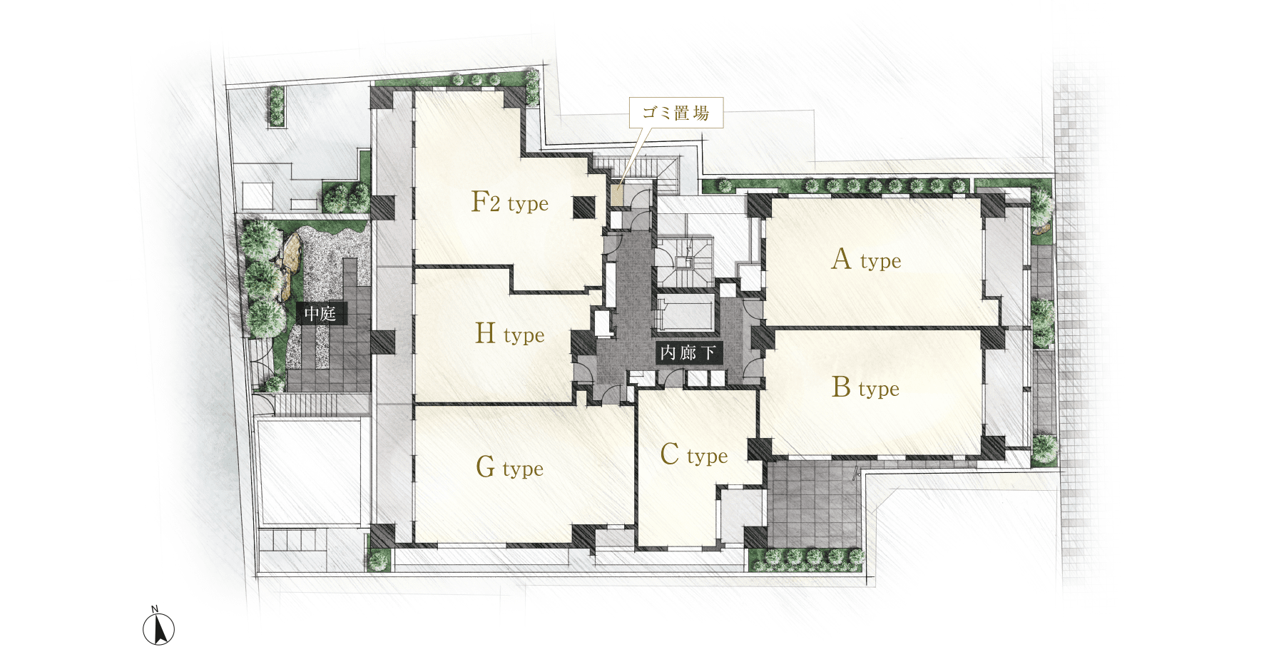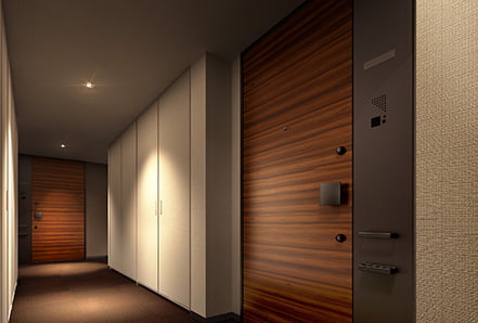プライバシーに配慮した内廊下設計が、開放感と安息感に満ちた日常をもたらす。