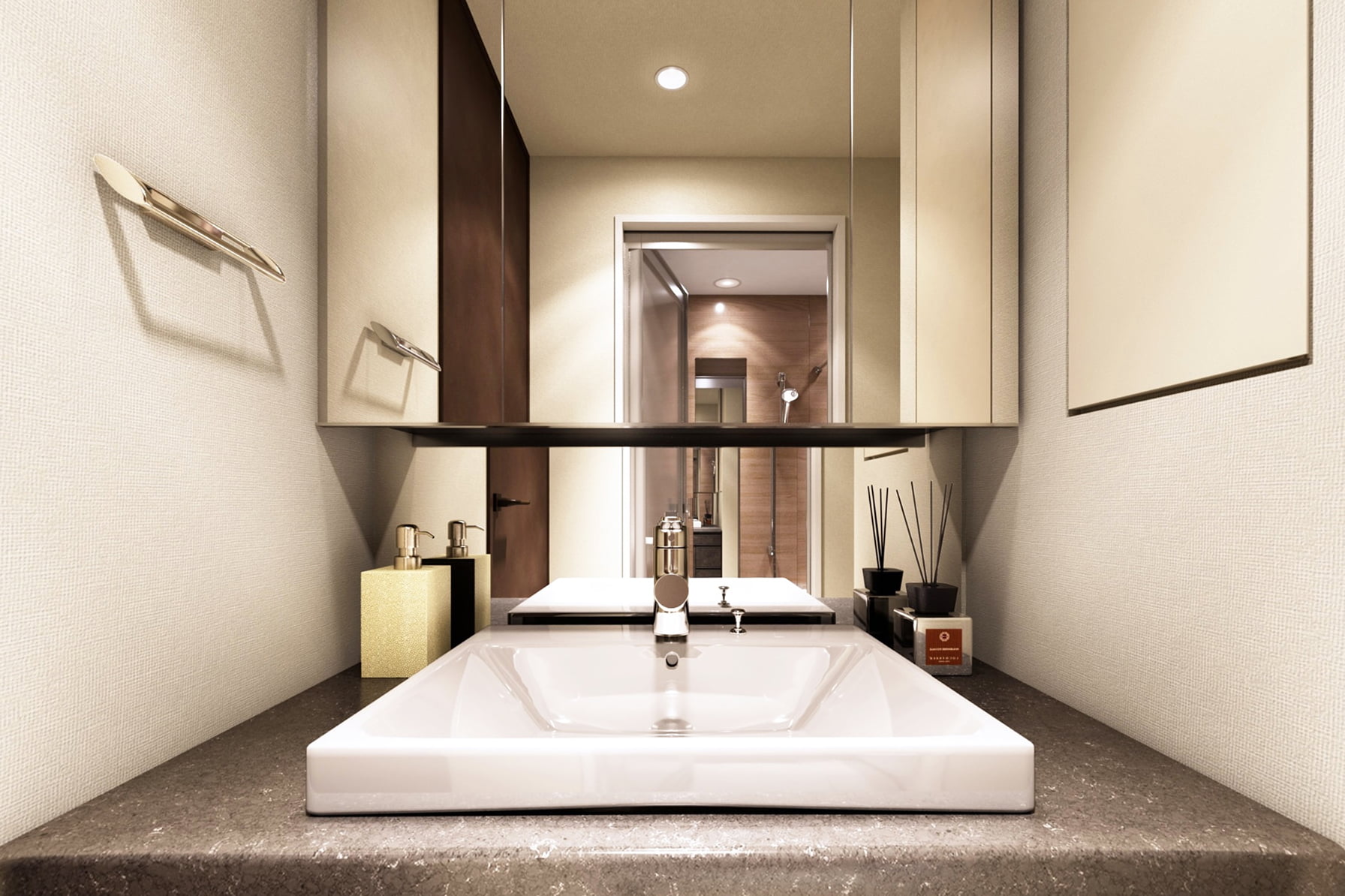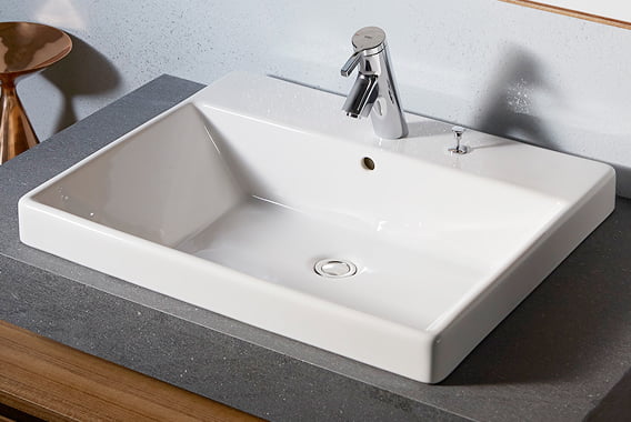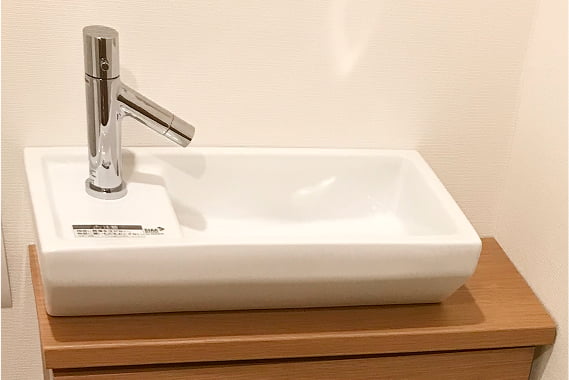 落ち着いた質感とスタイリッシュな形状の陶器製洗面ボウルを採用。