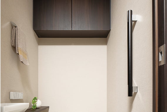 トイレットペーパーなどの収納に便利な吊戸棚を設置しています。