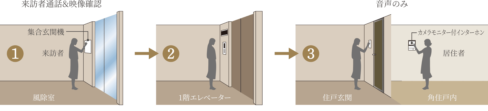 建物内への不正な侵入を抑止するために、トリプルセキュリティを採用。1階には風除室に加え、エレベーター前にオートロックを配した二重のセキュリティに、各戸のロックを加えた安心のトリプルセキュリティシステムです。