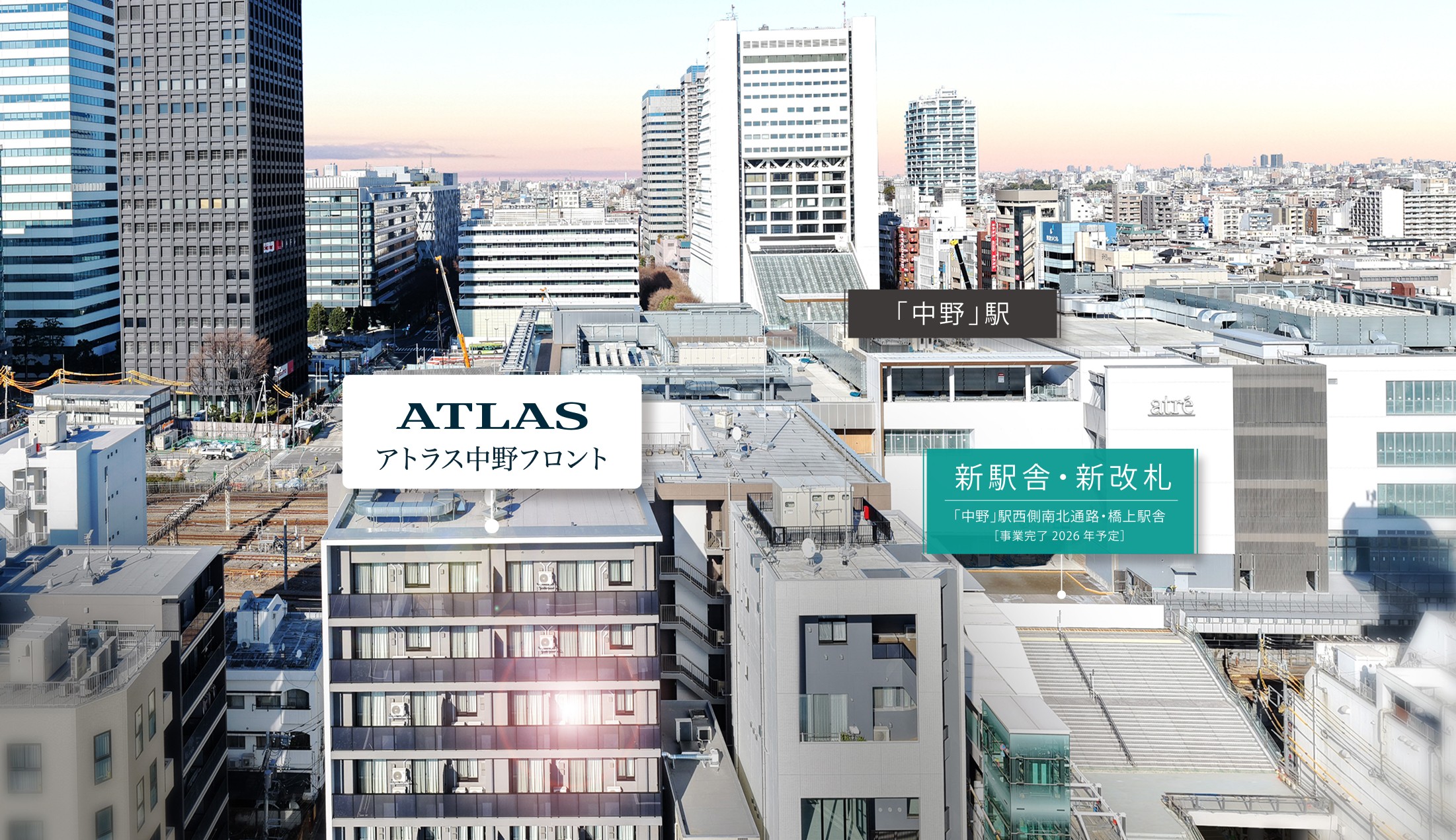 JR中央線・総武線、東京メトロ東西線「中野」駅 徒歩3分。2026年度「中野」駅西側新駅舎・新改札口至近。